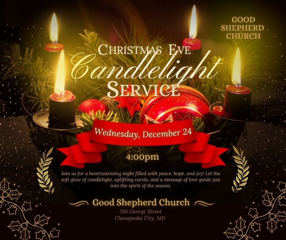Christmas Eve, December 24, Candlelight Service of Holy Eucharist with Music, 4 PM, at Good Shepherd.